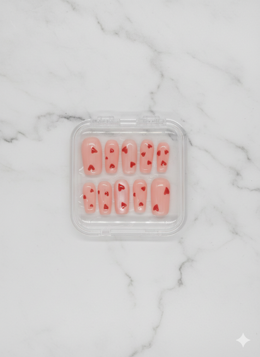 Romance pure est un set de press-on nails créer avec des tons rose, du chrome, Ornés de cœurs rouges éclatants.